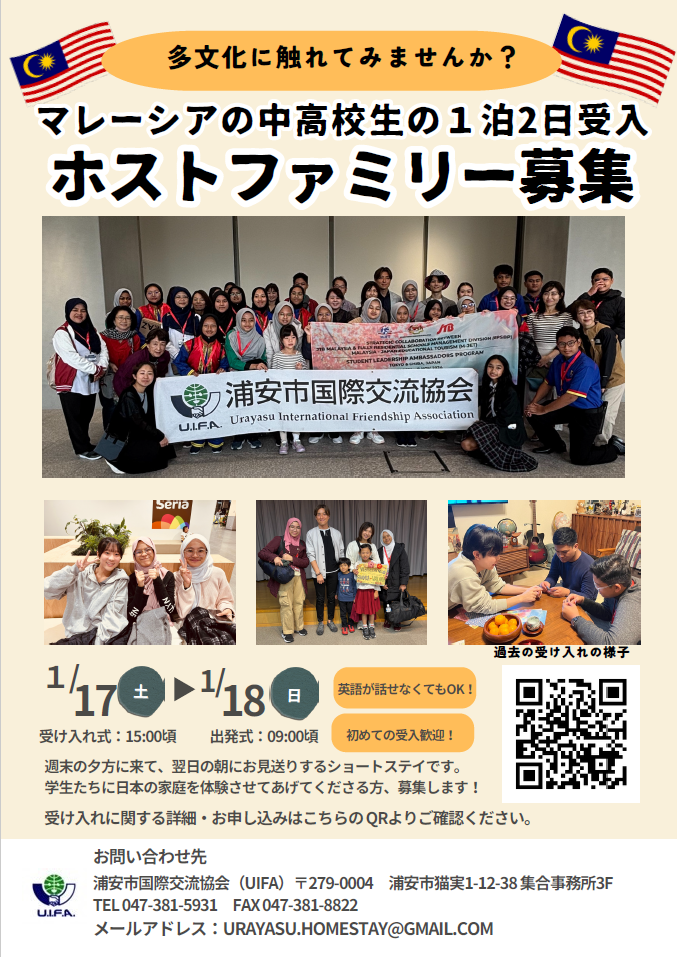 | その他 | ・先着順のため、定員に達し次第募集を締め切らせていただきます。 ・今年度UIFAへ未加入の方は、年会費1000円をお願いいたします。 ・これまでの受け入れ体験談などはこちら https://www.uifa-urayasu.jp/homestay/ ※説明会でもサポートさせていただきます。説明会は1月10日午前中を予定しています。 |