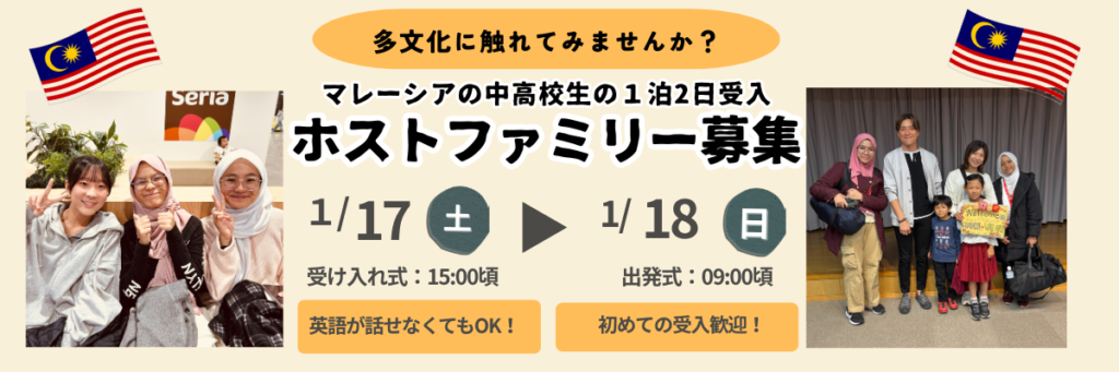 2026年1月に1泊2日で、マレーシアから来る中高生の受け入れファミリーを複数家族募集します。申し込み方法と詳細は以下をご確認ください。