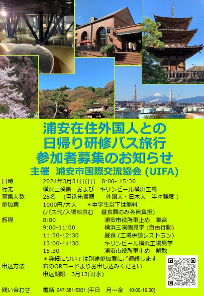 3月31日(日)に浦安市のバス、きずな号で外国人との日帰り研修バス旅行を開催します。