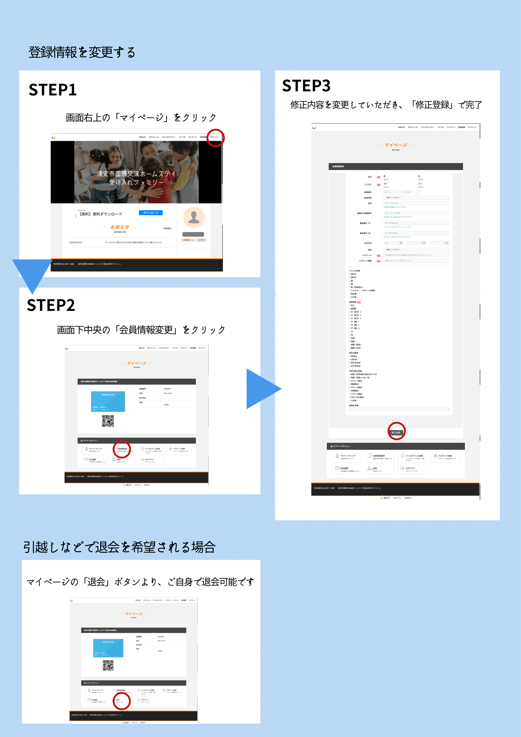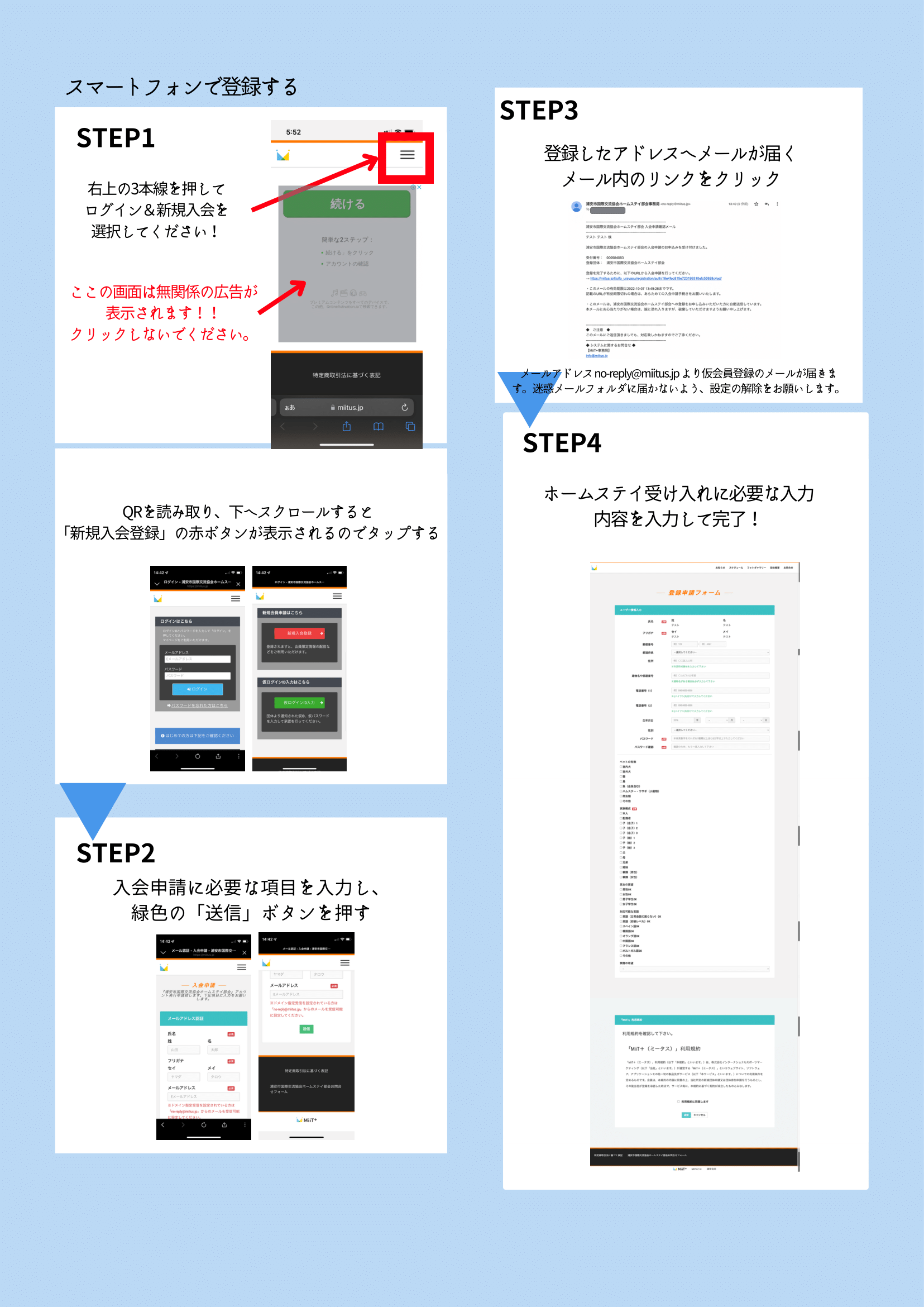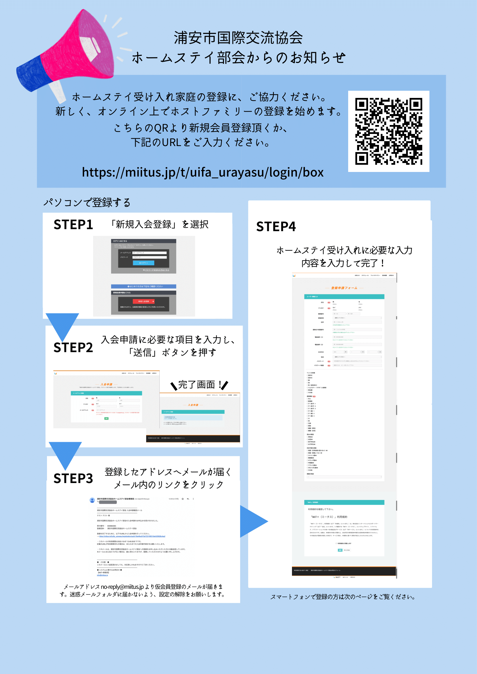 ホームステイ部会からのお知らせの注意事項を読んだのでホストファミリーに登録します。